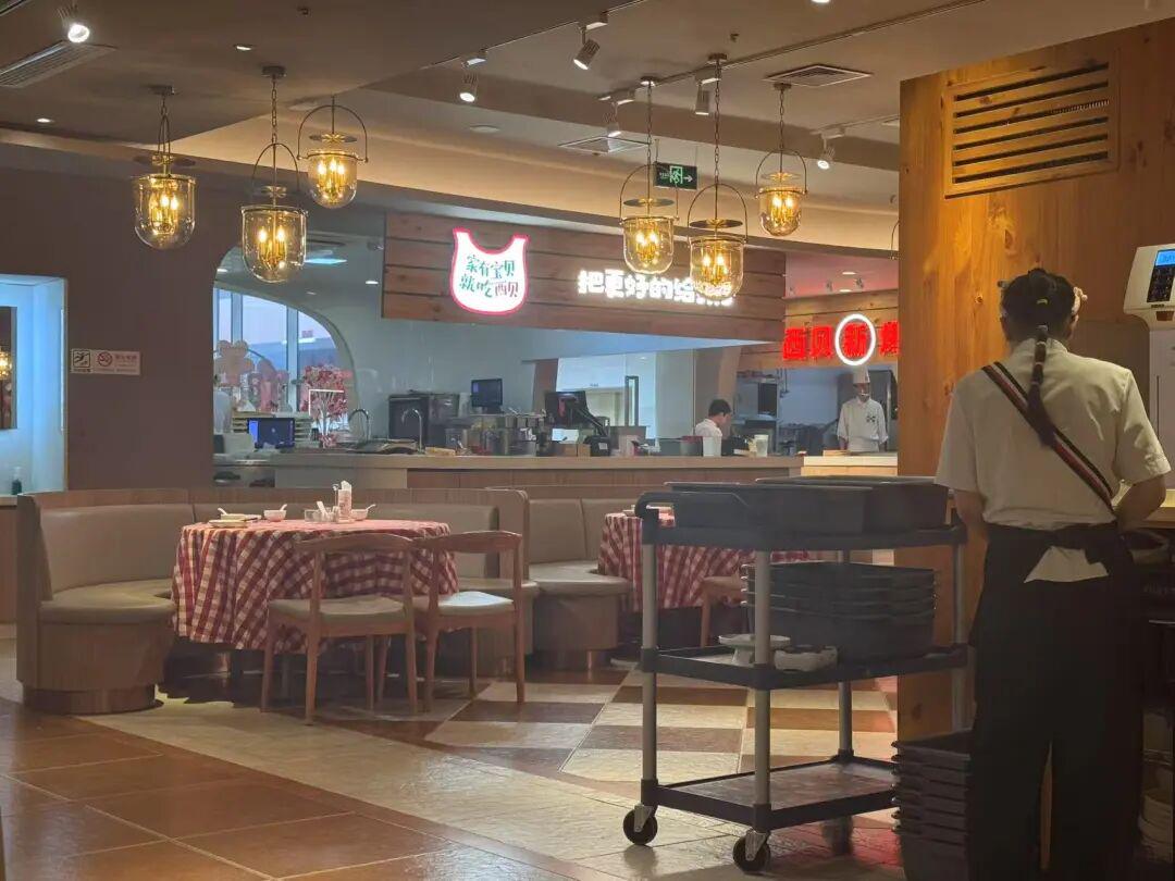 9月26日12:30左右,第一财经记者来到浦东新区的一家西贝餐厅。门店上座率大致在30%-40%,厨房里有厨师们正在现场制作,但由于生意一般,其他的厨师暂时没有在烹饪食材。