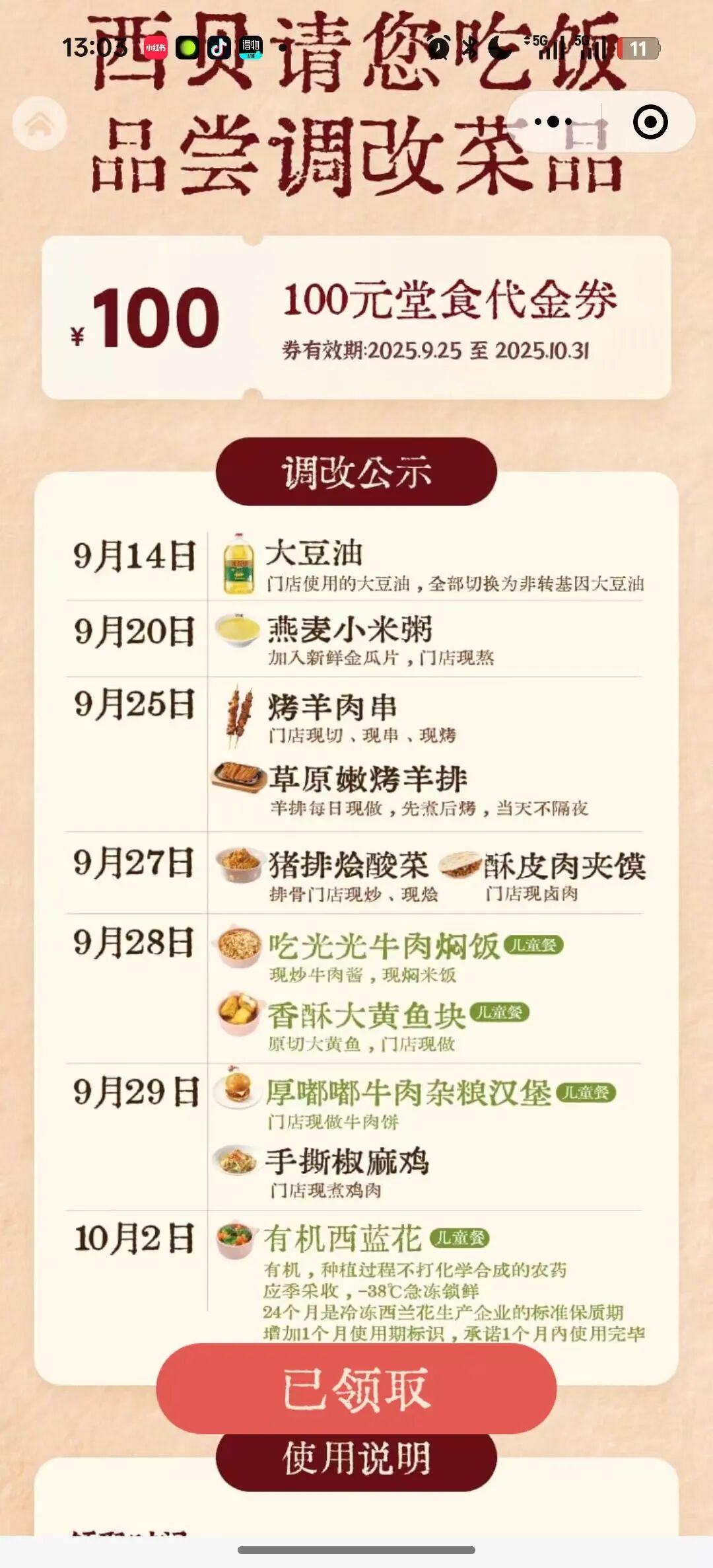 此外,调改公示显示,9月14日开始,门店的大豆油换成了金龙鱼非转基因大豆;9月20日开始,燕麦小米粥中加入新鲜金瓜片,门店现熬。9月25日开始,门店现切、现串、现烤羊肉串,而此前是调味好、串好、冷冻后再拿到门店来烤的。草原嫩烤羊排也开始每日现做,不销售隔夜羊排。9月27日开始,门店现炒现烩猪排烩酸菜、现卤肉夹馍中的肉。而在9月28日之后,儿童餐中的“吃光光牛肉焖饭”中的牛肉酱也变为现炒。