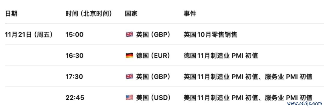 11月21日周五,新西兰在基本面上暂无重要数据和事件公布。值得关注的是,美国将于今日北京时间晚上22点45分,以及23点分别发布制造业以及服务业PMI采购经理人价格指数报告,消费者信心指数以及通胀报告修订值。