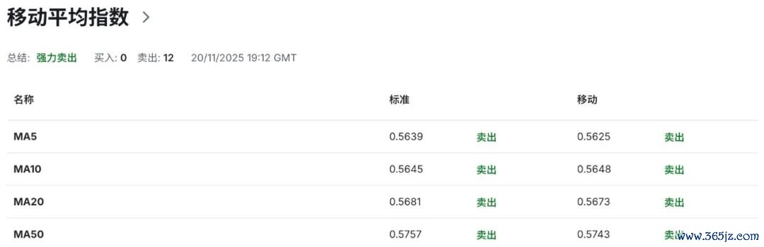 技术指标显示,日图级别上,本周纽币整体价格走势围绕于布林带中轨至下轨区间为中心开展核心交易中枢,伴随14日RSI相对强弱指标维持40以下弱势区间,并一度触及30超卖临界点,反映量价关系同步呈现弱势趋向边际化效应,空头动能仍占据主导优势,对汇价反弹构成显著压制力,而同时也提示续防范RSI指数在本周触及超卖临界点后的回升阶段反映“超卖-均值回归”风险在积累。与此同时,布林带维持向下开口,表明短期下行端动能保持充沛,结合MACD显示DIFF-0.0034、DEA -0.0037、DIFF值高于DEA,MACD柱状图维持负值区间与双线位于零轴下方维持放量,显示空头动能维持放量阶段,提示空头动能偏强持续性仍在上升,强化短期空头格局。如若后续柱状图呈现负值缩窄并出现零轴上方的回测,则才将有望触发真实技术性以及趋势性反弹的概率。此外,20日,50日以及100日均线系统呈现明显空头排列,近端曲线向下倾斜率限制纽币名义抬升概率,表明汇价短期以及中周期优势仍显著偏向空头一侧。布林带中轨当前位于0.5680附近区域,为纽币短期价格走势结构提供多空力量以及强弱格局核心分化枢纽,若汇价可成功回收至该区域上方,则才将有望触发真实性技术反弹并推动汇价进一步走高测试布林带上轨所指向的0.5785动态区域阻力提供积极信号。而布林带下轨当前向下方延伸至0.5575一线区域,为纽币短期价格走势提供潜在动态支撑。